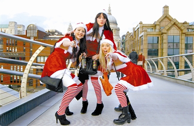 英国首都伦敦当地时间12月15日,人们打扮成圣诞老人的样子进行狂欢游行,参加2012“圣诞老人”大聚会活动。阿健 供图