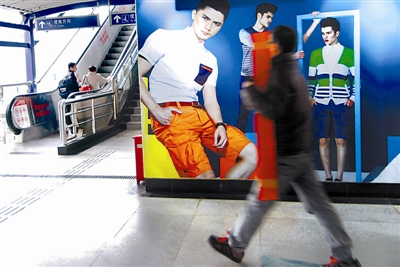 在武汉轻轨1号线利济北路站内,市民从一幅广告前走过(2月19日摄)。