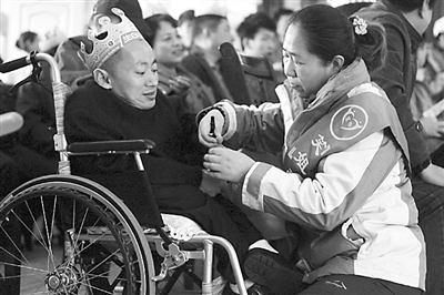 ⑤12月2日,青岛海底世界联合笑姐爱心助残团队,走进即墨市新远大残疾人托养中心,在寒冷的冬季为那里的残疾人朋友送去爱心物品。东方IC供图
