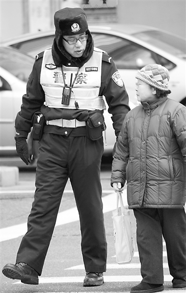 ③12月18日,上海阴冷,有时还飘雪花,气温在2至5摄氏度之间,大多数路人又穿上厚厚的冬装。图为该市成都路上的交警护送老人过马路。东方IC供图