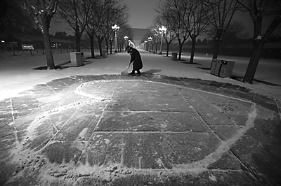 ⑥12月13日晚,北京迎来一场明显降雪。故宫午门广场前一位保安在雪地上扫出了“心”形图案。卓恩森/东方IC