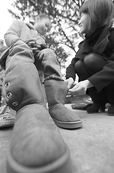 ②12月20日,四川省华蓥市溪口镇顺天寨村小学的留守学生,在试穿义工专程送来的保暖鞋。邱海鹰/东方IC