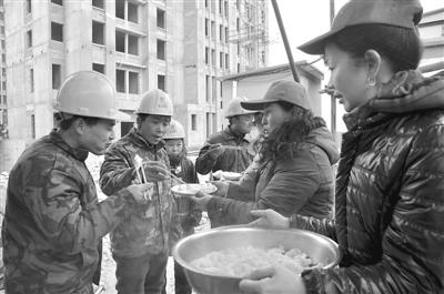 ①12月19日,在河北省邯郸市某建筑工地,和平街道办事处工作人员煮好热气腾腾的饺子,端给工作归来的工人吃。郝群英/东方IC