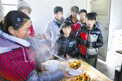 12月23日,“留守娃”们在食堂等待师傅准备的菜肴。在安徽省怀远县找郢乡茆塘村,有一个特殊的“家庭”,2008年,怀远县农村教师徐乃堂、顾云美夫妇筹资80万元创办了这所寄宿模式的留守儿童之家。这里,寄宿着当地156个父母均在外地打工的“留守儿童”。 高建业 摄