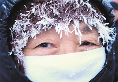 12月25日,一位出行的黑河市民帽子和围脖挂满冰霜。当日,黑河市迎来入冬以来最强的一次降温,最低温度下降到零下35摄氏度。 邱齐龙 摄