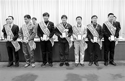 第四届全国职工职业技能大赛历时6个月,设车工、铣工、计算机程序员等7个竞赛工种,全国4000多万职工参赛,946名代表参加各工种决赛,参赛人数和规模均创历届大赛之最。图为获奖代表在台上领奖并合影。本报记者 许之丰 摄