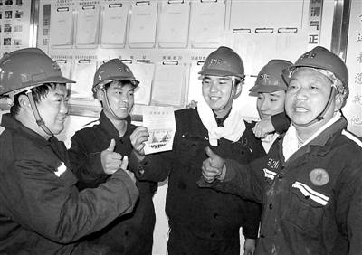 12月26日,淮北石台矿业基建四区青工杨淮海(中)接到安徽淮北职业技术学院的录取通知书后,工友们在为他祝贺。近年来,该公司强力实施“人才兴企、人才强企”战略,鼓励青工通过自学参加全国成人高考,并在资金、待遇、提干等方面享受优惠,让更多的矿工圆了大学梦。
