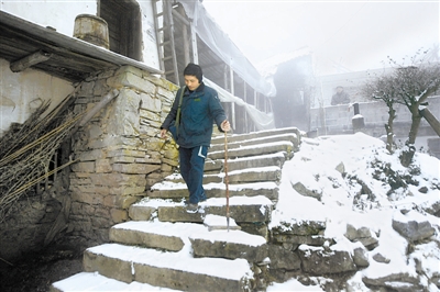 张美冲在车营村送完一户人家的报纸后,71岁的老大爷张运金站在门口目送他离开(12月23日摄)。