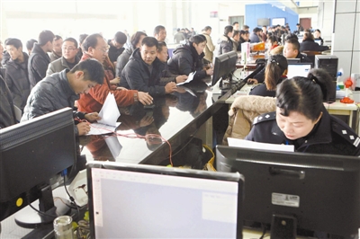 12月28日,在江苏省赣榆县公安局车辆管理所服务大厅,众多车主排队等候处理违章。