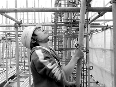 “砰砰……”陈代锋和同组的老乡寒暄几句后,操起地上的扳手在套着两根铁管的铁扣上使劲敲打,让铁扣紧扣铁管。他皱着眉头,眼睛紧盯着十字扣上的螺母,右手用力将螺母拧紧。