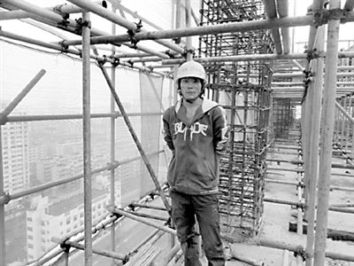 27岁的陈代锋,黄色的安全帽下,是一张因长期室外工作而晒黑的脸,瘦小的身形看上去格外年轻,像刚从学校毕业的学生,其实他已有7年的打工经历,是个2岁女孩的父亲。
