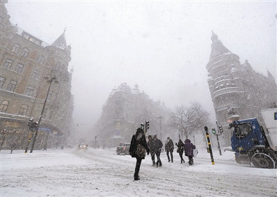 2012年12月5日,行人在漫天飘雪的瑞典首都斯德哥尔摩街头行走。新华社发