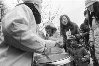 元旦假期,杭州西湖风景名胜区花港管理处每天中午免费向游客派送约500份皮蛋瘦肉粥,在寒冷的冬季用热粥“温暖”游客。据介绍,2013年春节期间,派粥活动将继续进行。 新华社记者 韩传号摄