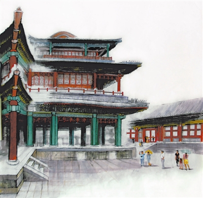 我国现存建筑规模最大的皇家戏楼颐和园德和园,日前完成了60年来规模最大修缮并封闭布展,将于今年3月开放。戏楼始建于光绪十七年(1891年),三层戏台高21米,是为慈禧太后60岁生日所建看戏娱乐生活之地,是清代宫廷戏剧活动的主要场所。德和园大戏楼被喻为中国京剧艺术的摇篮。图为以著名山水画家张臣杰先生笔法所画的德和园大戏楼景观。本报记者 路 林
