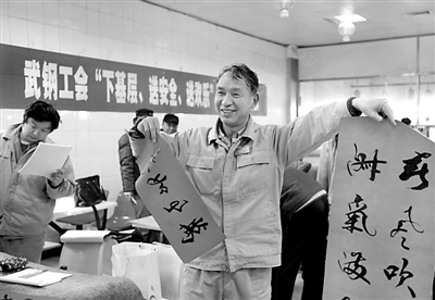 1月4日,武汉钢铁(集团)公司工会组织该公司省市书法家协会、美术家协会会员组成送文化下厂小分队,进行为期13天的“送文化下厂”活动,巡回为工人免费书写春联、画像、赠送年历,为职工送上新春祝福。本报通讯员 唐汉平 摄