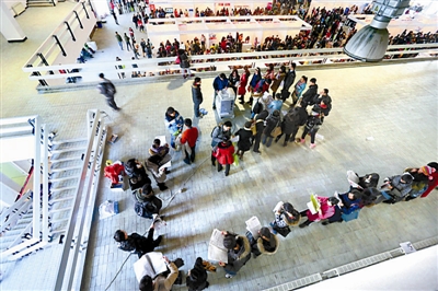 (1月6日,2013年北京首场招聘会“开锣”。上图为求职研究生排队加印简历。付丁 摄)