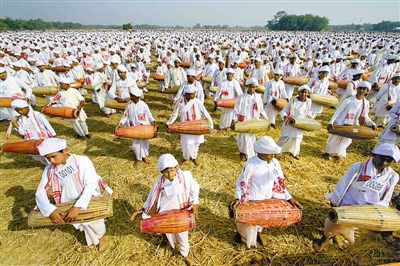 当地时间2013年1月6日,在印度阿萨姆邦,14833名身着传统服装的鼓者集体进行长达15分钟的演奏,试图打破吉尼斯世界纪录,成为最大的鼓乐队表演。谢涛 供图