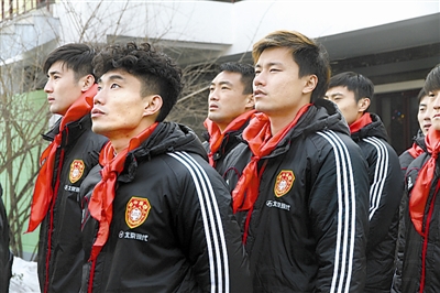 时隔多年后再次戴上鲜艳的红领巾,国足队员们倍感庄严和自豪。本报记者 李元浩 摄