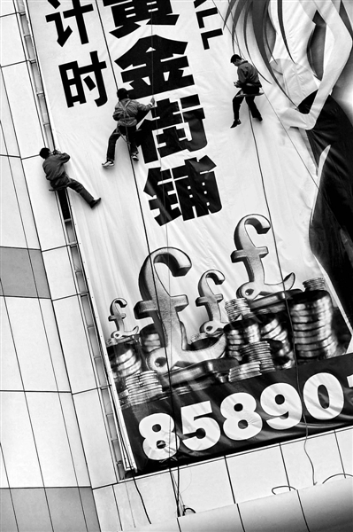 在江苏省南京市,房地产开发商销售商铺的广告挂于街头,吸引消费者投资。