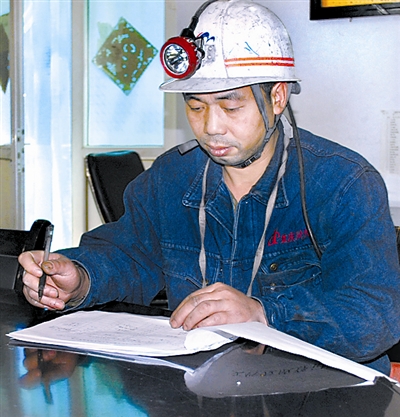 图为王佑出井后在调度室填写工作检查情况。