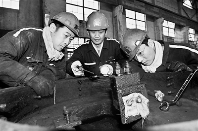 1月7日,安徽淮北矿业首席技能专家、桃园煤矿拔尖人才、综掘二区维修班班长王道文(中)在班组成立了领跑团队,并给这个团队立下两个硬指标:团队必须由优秀技能人才担任首席技师;安全生产的绝活、秘诀、法宝必须毫无保留地传授。这不,刚上班,王道文就给工友传授综掘机维修秘诀。