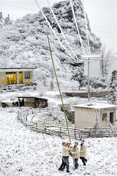 受持续凝冻天气影响,贵州电网部分线路出现覆冰。由于部分偏远地区无法使用融冰装置进行融冰,南方电网贵州电网公司贵阳供电局组织起“竹竿除雪队”,对无法使用融冰装置的电线进行人工除雪,保障供电线路通畅。 新华社记者 欧东衢 摄