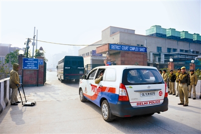 1月7日,印度新德里,印度黑公交轮奸案中的5名被告在新德里地方法院接受首次庭审,被告乘坐警方车辆抵达法院。CFP供图