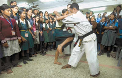 1月8日,印度南部城市班加罗尔的一家学校组织学生参加针对自身防卫的武术训练。CFP供图