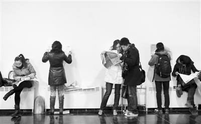 1月6日,应聘研究生在招聘会现场查看求职信息。当日,由北京市人才服务中心、北京市毕业生就业服务中心主办的2013年北京毕业研究生专场招聘会在中国国际展览中心举行,818家用人单位为毕业研究生提供了1.8万个就业岗位,参加本次招聘会的毕业研究生预计达4万人。 新华社发 万象 摄