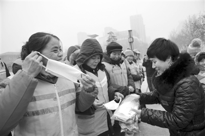 当日,邯郸市阳光超市准备了5000个优质棉质“暖心口罩”,送到该市4000余名环卫工人手中,帮助他们减少雾霾的“侵袭”。 郝群英 摄 (新华社发)