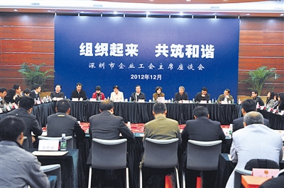 2012年12月26日,深圳市总工会召开主题为“组织起来,共筑和谐”的全市部分优秀企业工会主席座谈会,深入学习贯彻党的十八大精神以及习近平总书记在纪念宪法公布施行30周年大会、考察广东和深圳时的一系列重要讲话精神,集中围绕企业工会如何更好地发挥作用、如何当好一名企业工会主席等中心问题进行了座谈,总结推广深圳市优秀企业工会在开展企业工会工作方面的先进经验和做法,并对下阶段深圳市企业工会工作进行了部署。市委常委、统战部长张思平,市人大常委会副主任、市总工会主席罗莉出席,市各产业工会、各区总工会、市总机关各部室主要负责人和全市118家优秀企业工会主席参加座谈会。