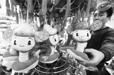 传统农历蛇年春节临近,消费者纷纷来到小商品市场选购喜庆“福”字、红灯笼、中国结、鱼、门神和对联等民俗饰品装饰房间,期盼蛇年风调雨顺,生活幸福。图为1月13日,在北京天意小商品市场,销售人员在给热销的蛇年民俗卡通“发财蛇”饰品玩具补货。阿静 摄