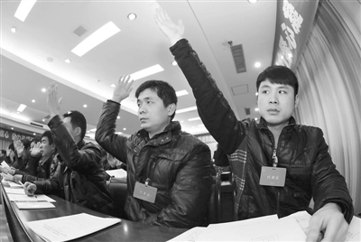 1月15日,职工代表在职代会上举手表决审议稿。安徽淮北矿业涡北矿拓宽企业民主管理渠道,建立完善职工代表联席会议、提案征集等制度,让职工代表积极参与企业管理,替职工说话、办事。7年来,共为职工办好32件实事,维护了职工切身利益。陈彪 摄