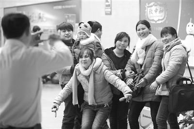 1月17日,来自江西的熊先生给同行的几位老乡在杭州火车站拍照,他们准备提前回江西老家过年。距2013年春运正式启动还有一周多时间,但杭州火车站的返乡客流已经开始增多。作为全国外来农民工主要输入地之一的浙江省,今年不少企业提前放假,许多外来务工人员考虑到火车票购票难等问题,选择提前返乡。新华社记者 鞠焕宗 摄