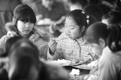 1月17日,金寨县汤家汇中心学校的学生们在吃午餐。从2012年下半年开始,安徽金寨县创新营养餐发放模式,从过去牛奶+鸡蛋、水果或面包的快餐式搭配逐步转变为给学生中午增加一道热腾腾的荤菜,为此该县投资4150万元用于山区学校厨房的新建、改建和设备升级,让山区孩子们的营养餐更有“营养”。新华社记者 杜宇 摄