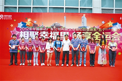 2012年,中国移动广东公司开展了构建企业核心价值体系的“五个一”工程,努力践行“厚于德、诚于信、敏于行”的新时期广东精神,担当社会责任。活动开展以来,中国移动广东公司一直将文化品牌培育、教育基地建设、先锋模范评选、文化产品创作及文体活动开展这五方面工作作为移动基础性工作常抓不懈,中国移动广东公司工会按照构建企业核心价值体系“五个一”工程实施要求和部署,全省工会确立了以“服务企业和谐发展、促进员工价值成长”的工作主线,强化工会组织“为员工服务、为发展加油、为企业分忧”三大作为,全面履行工会职能,扎实推进思想疏导、和谐维护、员工关爱、建功立业、素质提升等重点工程,为企业健康科学发展提供坚强的支撑和有力保障。全省共培育了近10个文化品牌、建设超过40个教育基地、开展18个先锋模范评选活动、打造近50种文化产品、举办70多场文体活动,推动当前企业的改革发展。