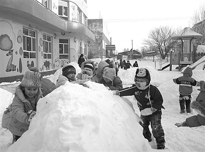 黑龙江宝清县八五二农场投资1500多万元,在场部中心地区新建、改建幼儿园近4000平方米,为农场职工200多名适龄幼儿提供良好条件。图为农场中心幼儿园的幼儿们正在高兴地堆积雪人。