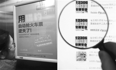 左图为北京一座大厦电梯内悬挂的“抢票软件”广告;右图为一家网络商城里销售的各种“抢票软件”(1月18日摄,拼版照片)。