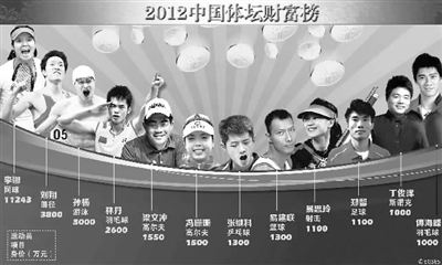“2012中国体坛财富榜”由国内某知名专业体育报纸组织调查,在这份榜单中,网球运动员李娜以1.12亿元人民币的年收入排名第一。这也是李娜连续第二年在该排名中位居首位。刘翔虽然在去年的伦敦奥运会上因伤退赛,却依然凭借数量众多的商业赞助,以3800万元的年收入位居第二;在伦敦奥运会上大放异彩的泳将孙杨,则以3000万元排名第三。羽毛球名将林丹和高尔夫选手梁文冲,分别以2600万元和1550万元的“进账”,名列第四、五位。