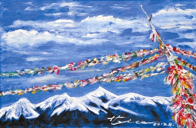 在西藏,每一年的藏历新年,人们都会重新插挂“风马”旗——经幡。以新年的“托随”仪式消除过去一年的不愉快。这时候如果站到高处俯瞰整个拉萨,满城崭新的风马接地连天,迎风飘扬,人们祈求福寿安康的愿望也随风升腾,新的一年又开始了,幸福的生活也开始了。此油画为慈善家李春平所收藏。苏克 绘画