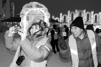 1月20日,两名环卫工人正在哈尔滨冰雪大世界拍照。据了解,1月20日~25日,哈尔滨马迭尔集团投入300万元,与该市城管部门联合组织万名环卫工人免费游览冰雪大世界。当天,首批1700名环卫工人走进冰雪大世界开心游玩。 王忠岩 摄