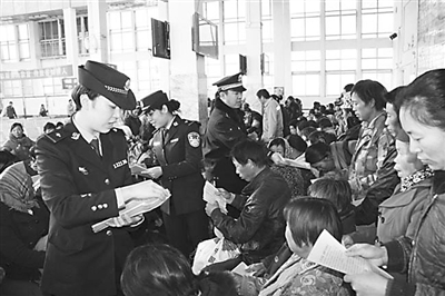为确保广大采棉工春运期间能够安全、顺利返程,库尔勒铁路公安处乘警支队近日深入各次临客列车、车站广场及候车区,宣讲打击倒卖车票违法犯罪有关法律法规知识、购买火车票基本常识及相关注意事项。(孙婉茹)