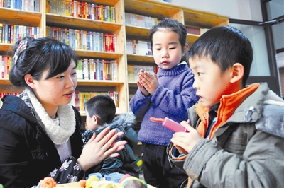 1月22日,在社区的寒假快乐课堂上,志愿者牟媛媛(左一)和孩子们一起玩橡皮泥。