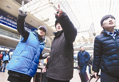 北京西站,来自北京城市学院的志愿者为旅客指路。