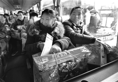当日,南京市交通运输局2013年“温暖春运”行动在南京中央门长途汽车站启动,首批135名经济困难农民工分乘3条线路的免费专车,高高兴兴回乡过年。江苏省暨南京市欢送农民工平安返乡“红红火火过大年”志愿服务活动同时在车站展开,志愿者们向乘车农民工赠送了春节大礼包、贺年卡等慰问品。新华社记者 孙参 摄
