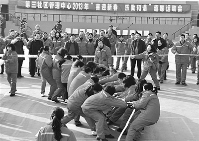 1月25日,中原油田第三社区管理中心举办2013年“喜迎新春、乐助和谐”趣味运动会。此次运动会共设《写字赛》、《开动火车》、《架桥过河》、《七个小矮人》、《横绳拔河》等5个项目。中心机关各基层单位组成32支参赛队, 360名员工上场一显身手。图为“横绳拔河”场面。本报通讯员 赵则阳 王翠婷 摄