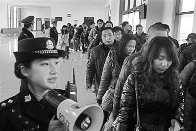 1月25日,西安铁路公安局西延公安处蒲城车站派出所女民警吴静组织旅客有序进站。这是这位90后女警第一次参加春运。刘卫国 摄