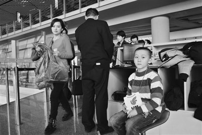 1月26日,跟随父母在北京读书的儿童杨立义正在首都机场3号航站楼办理登机手续。春节期间,由于他的父母因工作不能回老家过春节,因而他要在乘务人员的带领下独自乘坐飞机被“邮寄”回到四川老家与爷爷奶奶团聚。