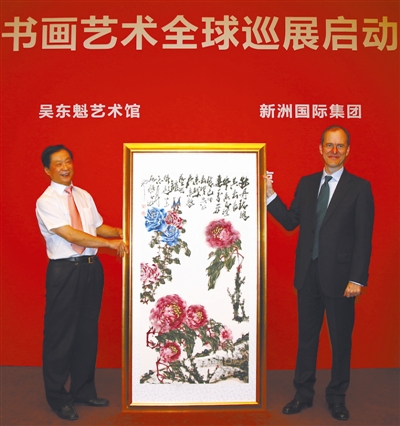 1月19日,“美丽中国·文明对话——吴东魁书画艺术全球巡展启动仪式”在北京钓鱼台国宾馆举行。英国大使吴思田代表英国驻华使馆接受吴东魁捐赠的新作“牡丹玫瑰”。(源源)