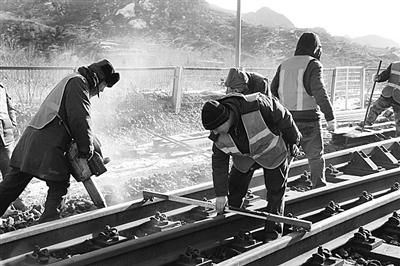 为确保春运期间线路设备安全稳定,近日,太原铁路局茶坞工务段利用每月有限的3个“天窗点”积极整治线路设备,全段干部职工总动员,以车间为单位,集中力量对设备病害进行综合整治,解决影响安全的关键问题。图为下庄线路车间干部职工进行更换道岔辙叉作业。高智强 摄